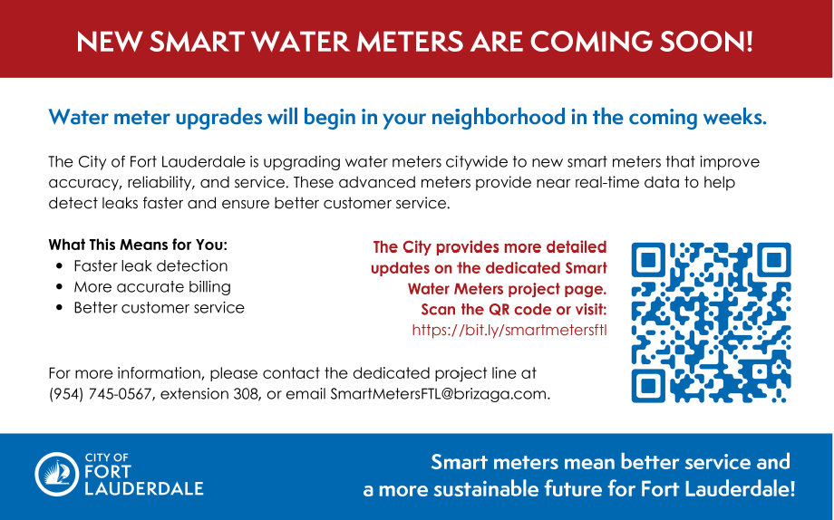 The City of Fort Lauderdale is upgrading water meters citywide to new smart meters that improve accuracy, reliability, and service. These advanced meters provide near real-time data to help detect leaks faster and ensure better customer service.